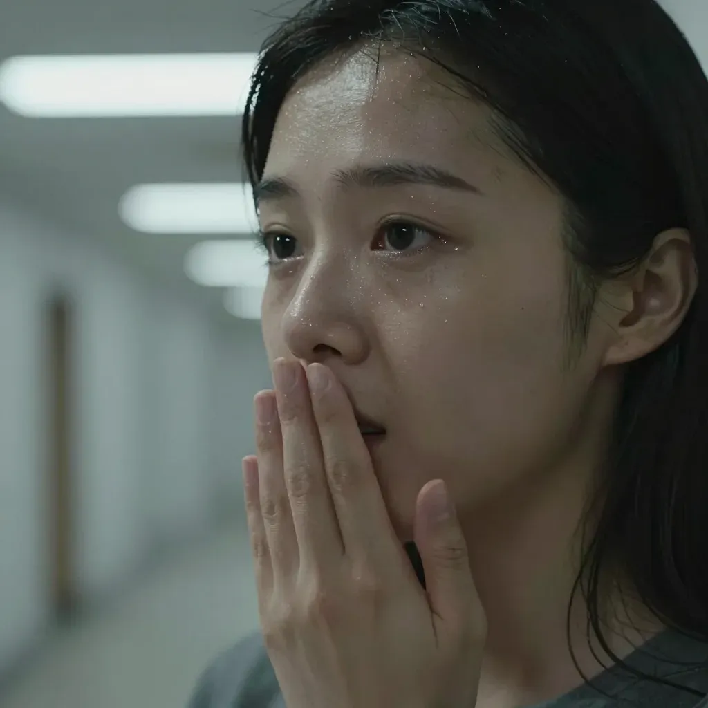 A woman in a hospital hallway, visibly anxious and sweating, with her hand to her mouth. The image is captured with harsh fluorescent lighting, creating high contrast and specular highlights on her sweat-drenched skin, emphasizing the emotional intensity of the scene.