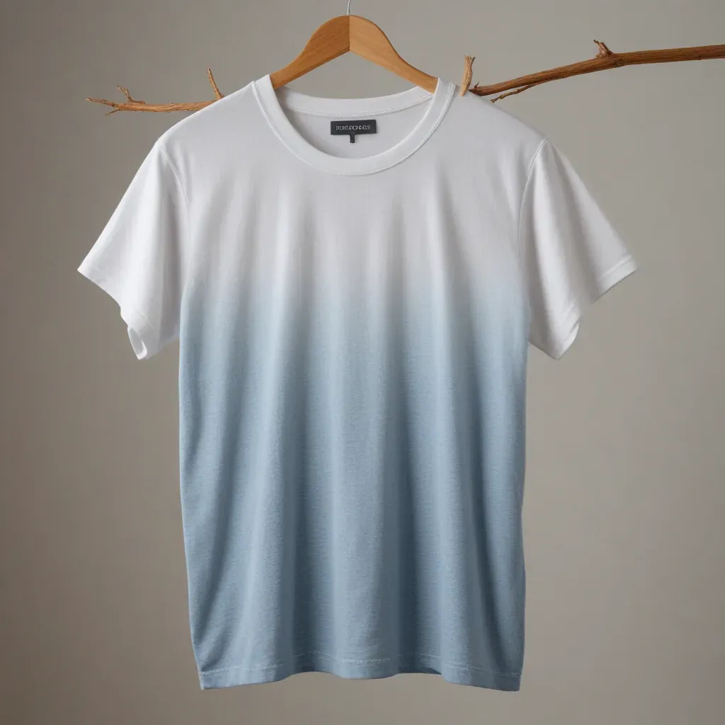 A white T-shirt with a gradient from white to ocean blue hangs straight against a neutral beige background, illuminated by soft, diffused light from above, creating gentle shadows and highlights. The composition is centered, with ample copy space for design integration.