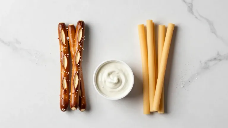 A symmetrical arrangement of pretzel sticks, cheese sticks, and a creamy dip, with soft, diffused lighting highlighting the textures and creating gentle shadows on a clean white marble background.