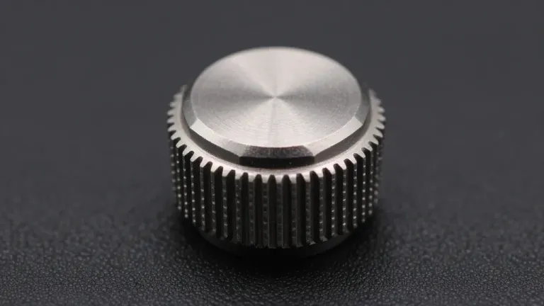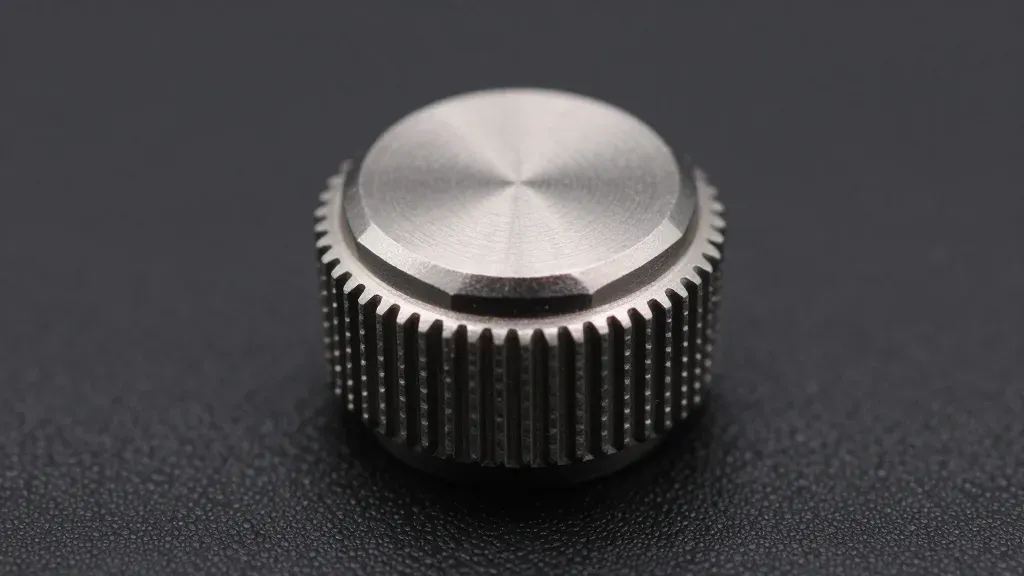 A close-up of a polished metal watch crown with gear-like teeth, highlighting its smooth and slightly rough texture under soft, directional lighting. The dark, blurred background emphasizes the crown as the main subject, creating a shallow depth of field.