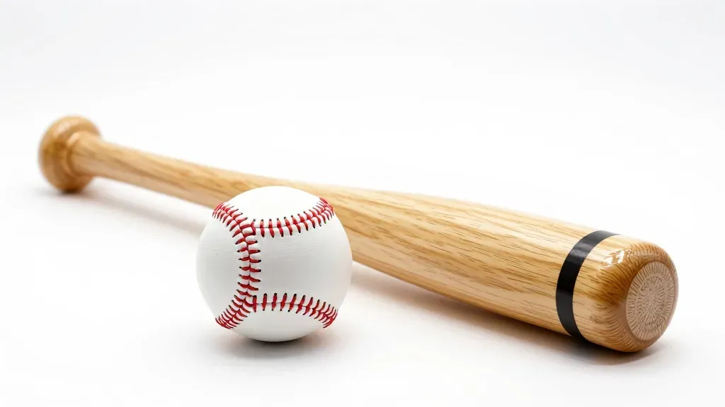 A crisp white baseball with raised red stitching rests beside a polished wooden bat with visible grain and black tape near the knob, both arranged diagonally. Soft high-key studio lighting from the upper left creates gentle highlights and a shallow depth of field, with a clean off-white background providing ample negative space.