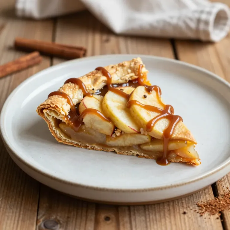 A slice of caramel apple galette with crispy apple slices and glossy caramel sauce, set against a warm, soft light that highlights the golden crust and glossy caramel. The shallow depth of field and centered composition emphasize the galette, making it perfect for culinary and food photography.