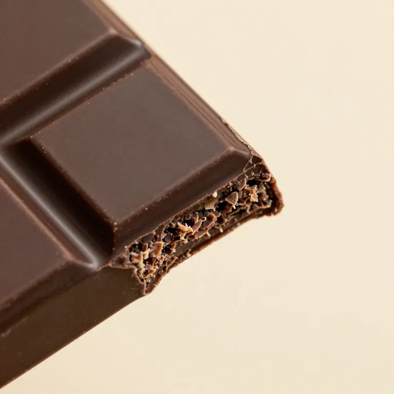 A close-up of a dark chocolate bar breaking, revealing its rough, crunchy interior under soft, diffused lighting. The neutral, light beige background enhances the rich, warm tones of the chocolate, creating a clean and focused composition.
