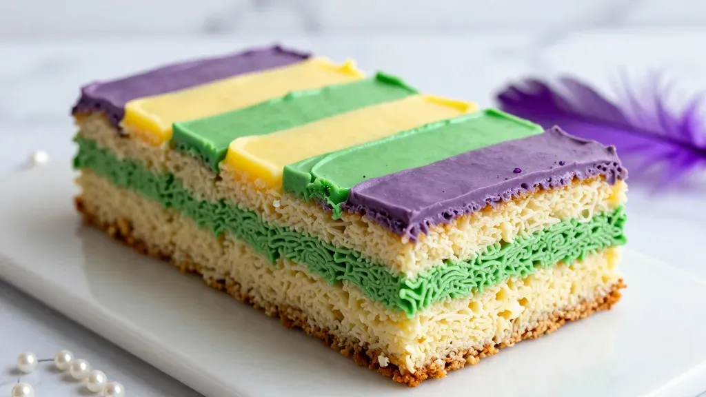 A close-up of a layered sheet cake with glossy frosting in vibrant purple, yellow, and green hues, highlighting the crumbly texture and soft, diffused lighting. The blurred background with a purple feather and white pearls adds elegance and depth, making it ideal for culinary and food photography.
