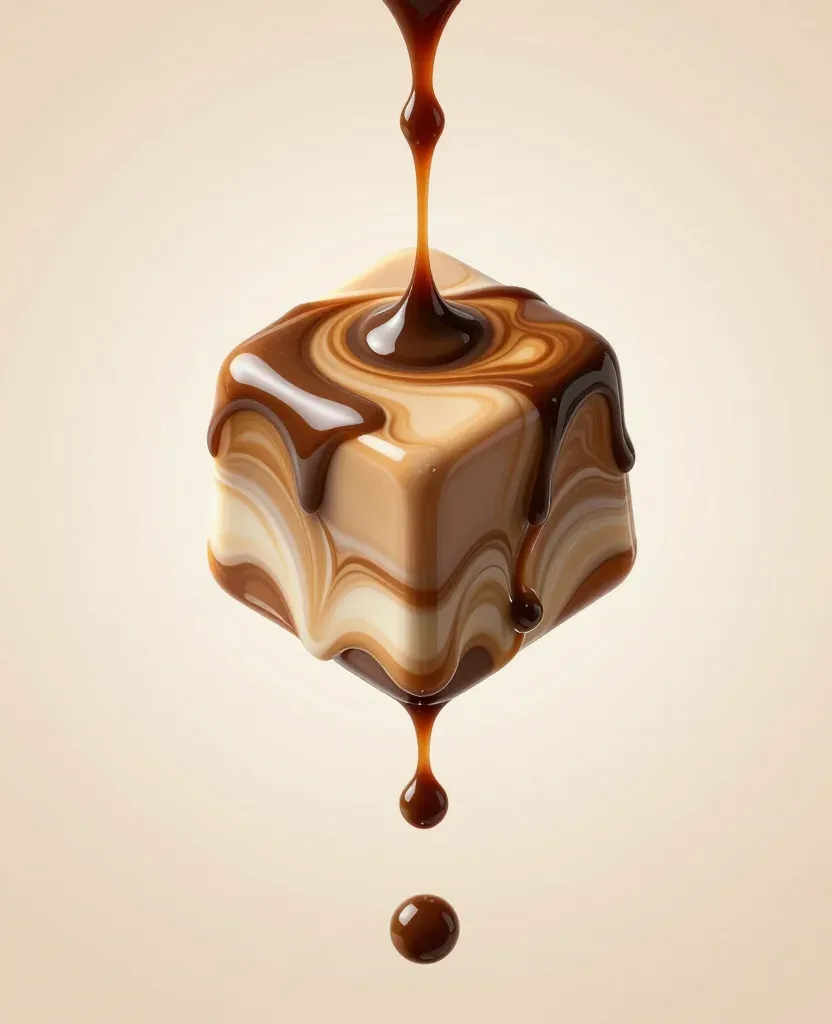 A cube of creamy coffee is enveloped in glossy chocolate sauce, creating a visually striking cascade effect. The soft lighting and neutral background emphasize the rich textures and colors, making it perfect for culinary and food-themed designs.