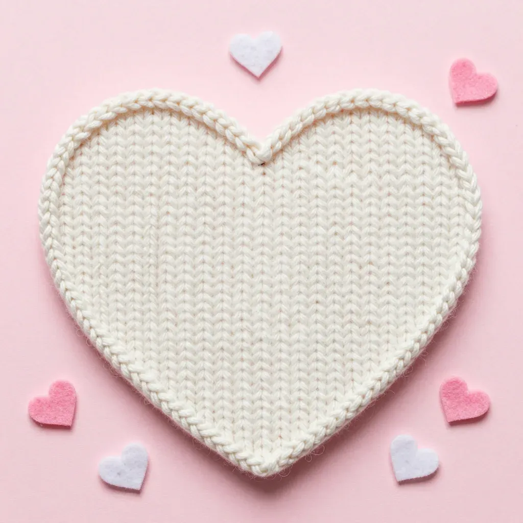 A soft, knitted heart-shaped coaster with a slightly raised texture, surrounded by small pink and white felt hearts on a pale pink background. The diffused, soft lighting highlights the texture and casts gentle shadows, creating a clean and simple backdrop that enhances the subject.