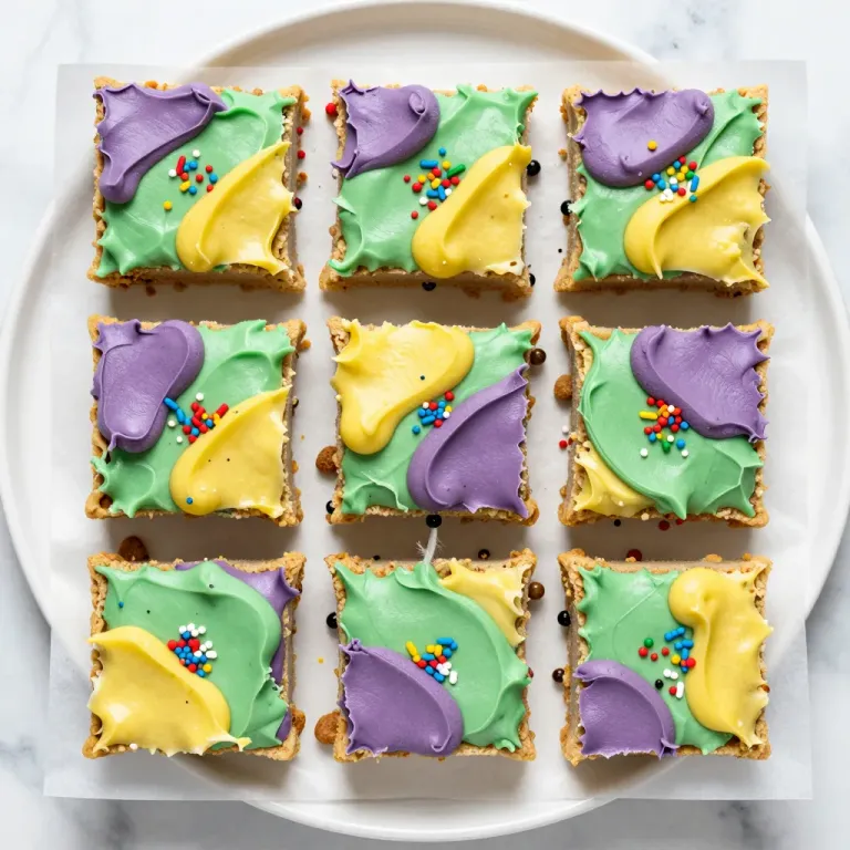 Vibrant confetti cookie bars with glossy yellow and purple icing, arranged neatly in a grid on a clean white surface, highlighting the glossy finish and even lighting.