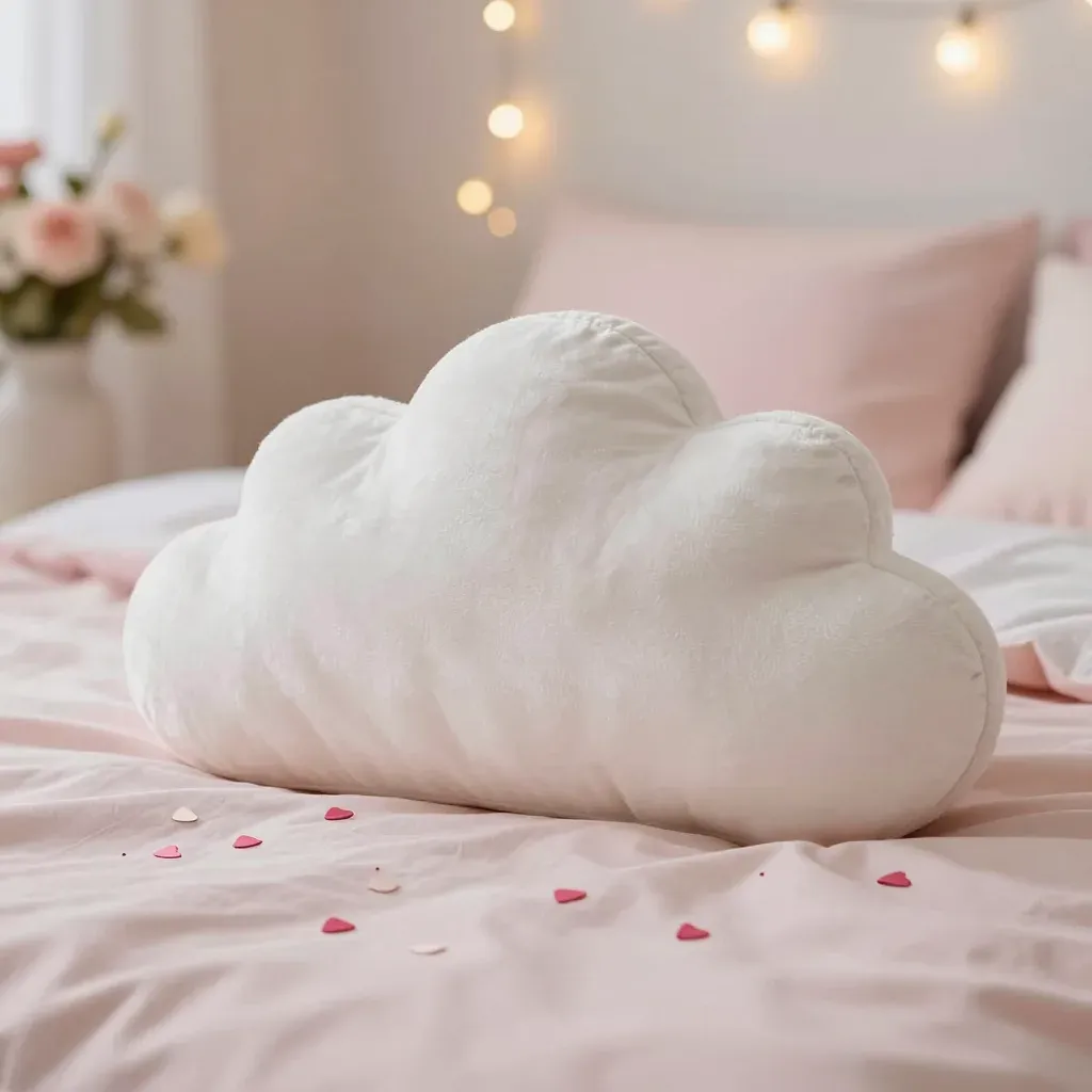 A soft, velour cloud-shaped pillow adorned with pink heart-shaped confetti, set against a warm, string-lit background, creating a cozy and romantic ambiance. The soft lighting and shallow depth of field enhance the pillow's texture and the scattered confetti adds a playful touch.