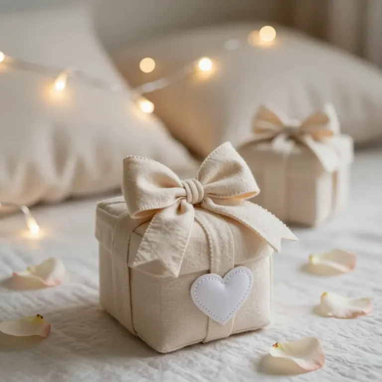 A delicate gift box adorned with a soft fabric bow and scattered petals, bathed in warm, diffused fairy lights. The composition centers on the box, framed by petals at the bottom, creating a serene and romantic atmosphere.