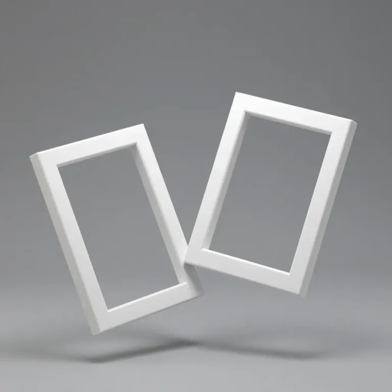 Two glossy white picture frames float symmetrically in mid-air, casting soft shadows against a muted gray background. The minimalist composition and diffused lighting create a clean, modern aesthetic ideal for interior design or abstract art displays.