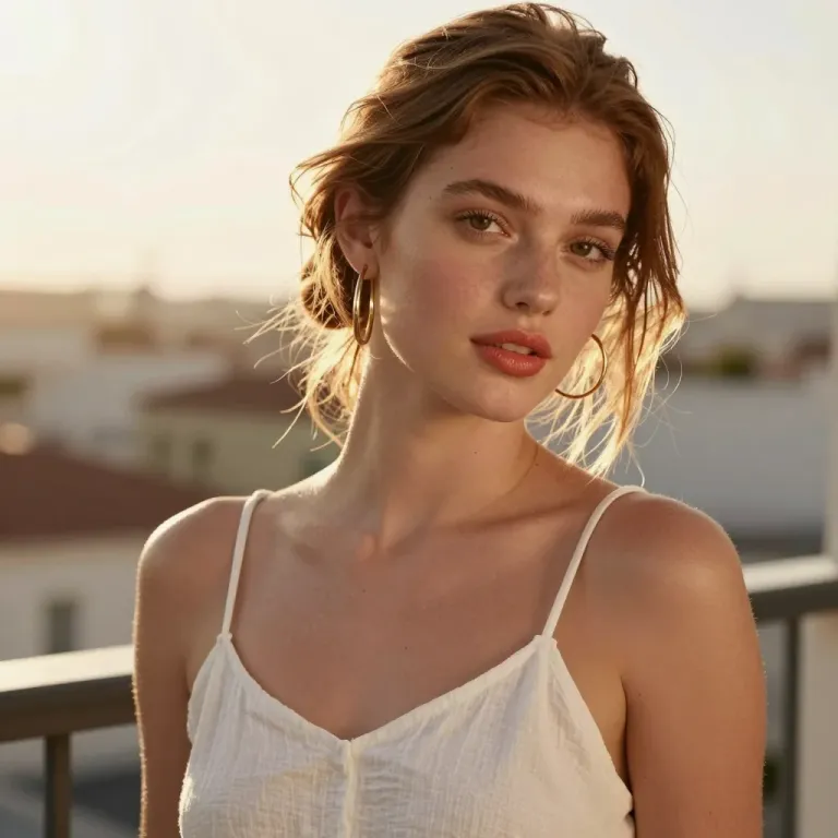 A woman in a white, sleeveless dress stands on a balcony bathed in golden hour light, creating a warm and inviting glow that highlights her features and the delicate texture of the dress. The blurred background of rooftops and buildings complements the subject's attire, offering a clean and focused composition.