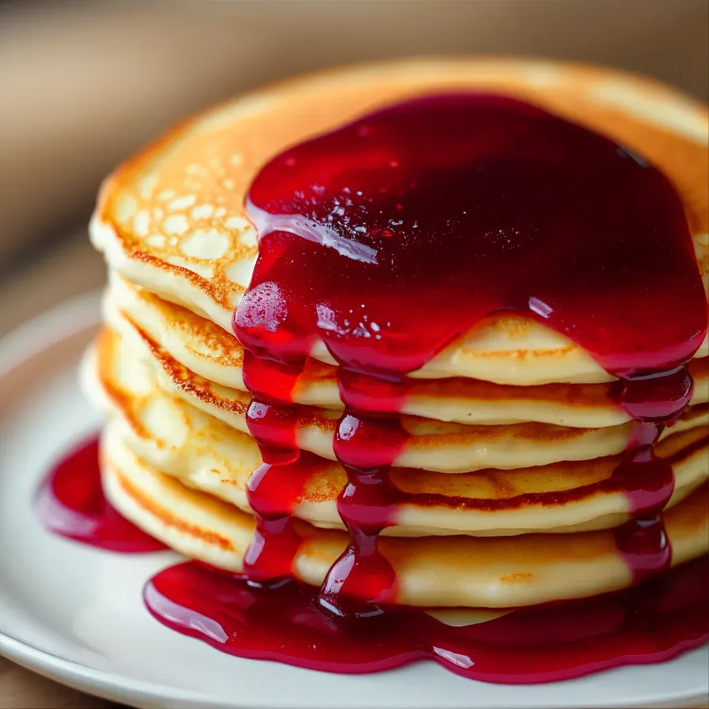 A close-up of a stack of golden pancakes generously drizzled with glossy cherry sauce, illuminated by warm ambient light that enhances the rich textures and vibrant colors. The shallow depth of field ensures the pancakes and sauce remain the focal point, creating a sense of indulgence and abundance.