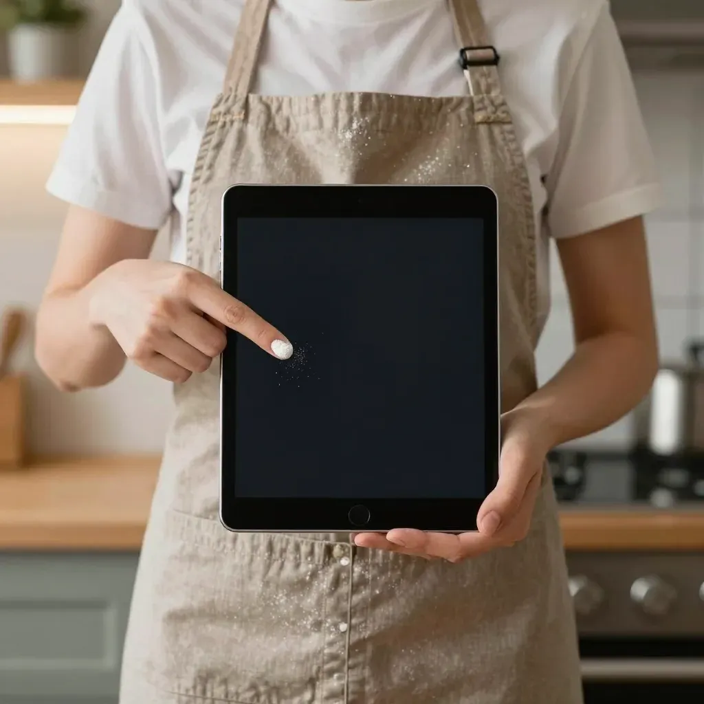 A person in a beige apron holds a black tablet with flour speckles, set against a softly lit, cozy kitchen background. The warm lighting and shallow depth of field create a focused and inviting atmosphere.