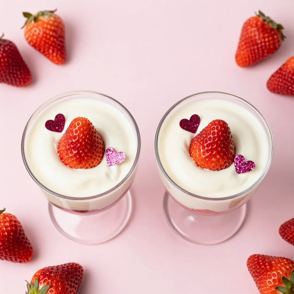 Two parfait cups filled with creamy yogurt and topped with glossy strawberries and glittering pink hearts, set against a soft pink background. The gentle diffused lighting highlights the textures and creates a clean, minimalistic backdrop with ample copy space.