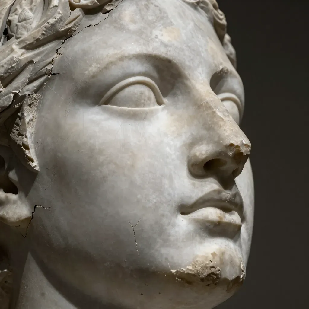 A close-up of a marble statue face, partially damaged with visible cracks and chipped fragments, illuminated by soft, diffused light that highlights the contours and casts subtle shadows. The dark, blurred background emphasizes the statue as the main subject, providing a shallow depth of field.