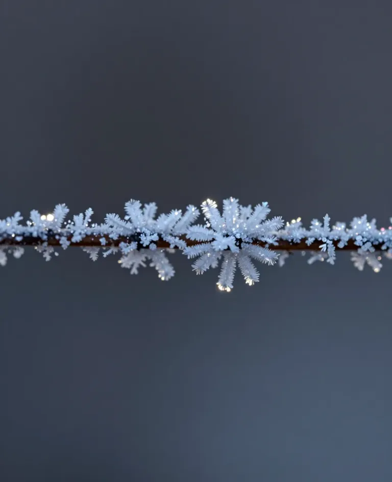 A delicate branch adorned with crystalline frost, illuminated by soft, diffused light that creates a sparkling effect, highlighting the intricate details of the frost crystals against a dark, uniform background.