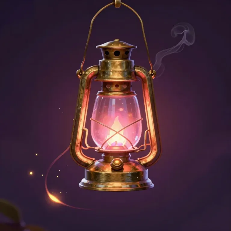 A vintage brass lantern with a lit flame inside, casting a warm glow and creating a dreamy, ethereal effect against a dark, blurred background with subtle purple and pink hues. The composition is centered, with the lantern as the focal point, slightly elevated to give a sense of depth and dimension.