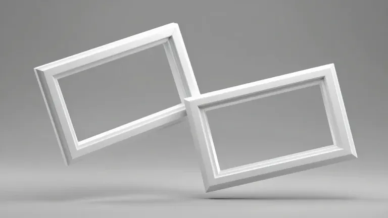 Two smooth, glossy white frames intersect at a sharp angle, creating a sense of depth and tension. Soft, diffused lighting highlights the frames' edges and reflections, set against a uniform, muted gray background that emphasizes the subject.