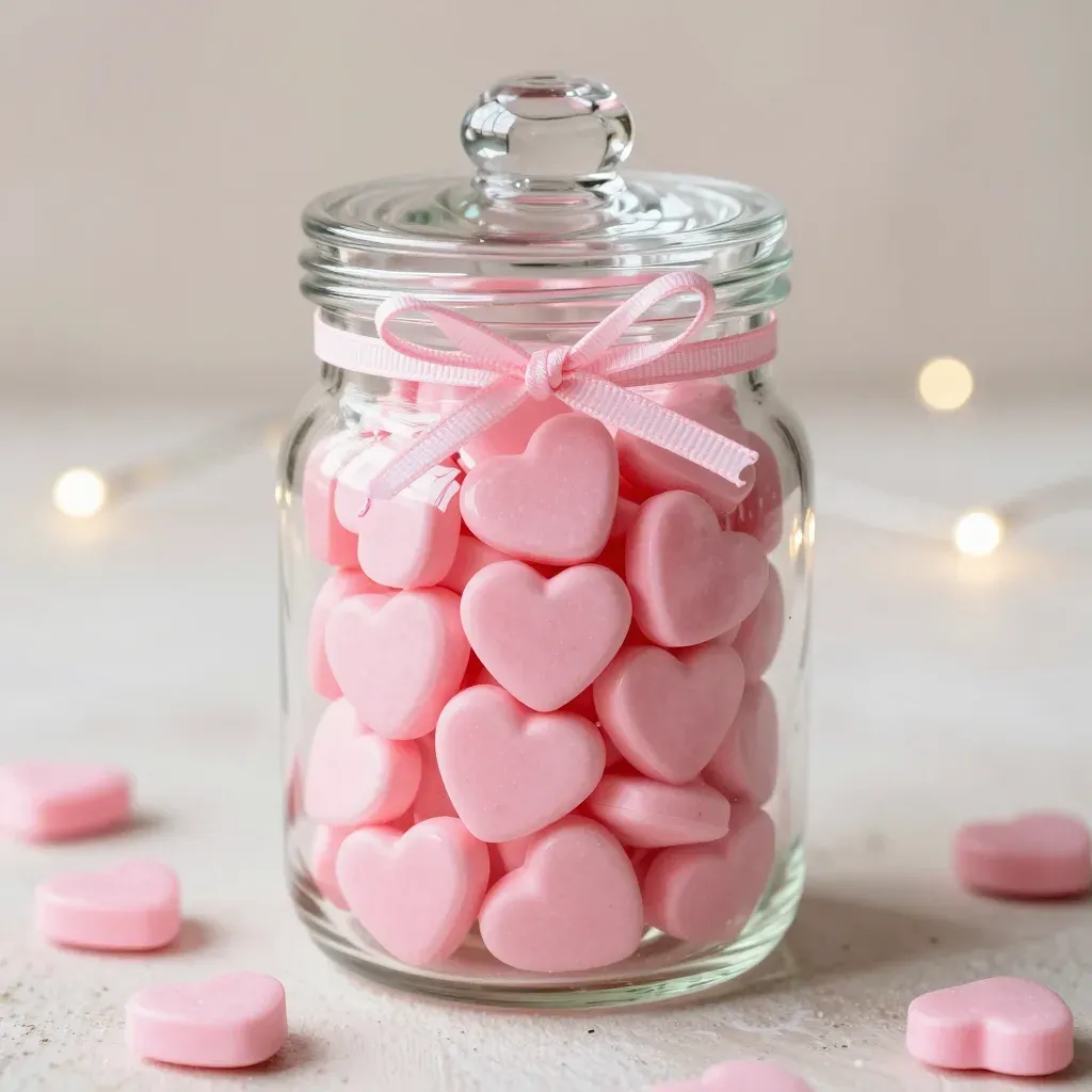 A glass jar filled with glossy, smooth pink heart-shaped candies, softly lit to create gentle shadows, set against a blurred background with twinkling lights, suggesting a festive or romantic setting. The shallow depth of field draws attention to the candies and jar, making it ideal for product or gift imagery.