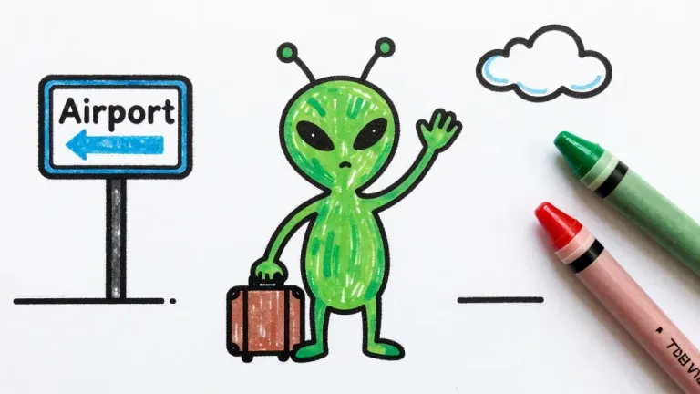 A curious green alien with wide eyes waves at an airport sign, illuminated by soft, diffused lighting. The minimalistic background with scattered crayons and a cloud adds a playful, creative touch.