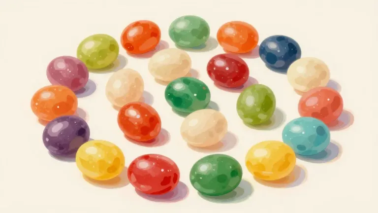 A collection of glossy jelly beans in vibrant colors is scattered on a plain white background, creating a visually appealing and clean composition. The soft, diffused lighting highlights the reflective surfaces of the jelly beans, enhancing their glossy texture and making them the focal point of the image.
