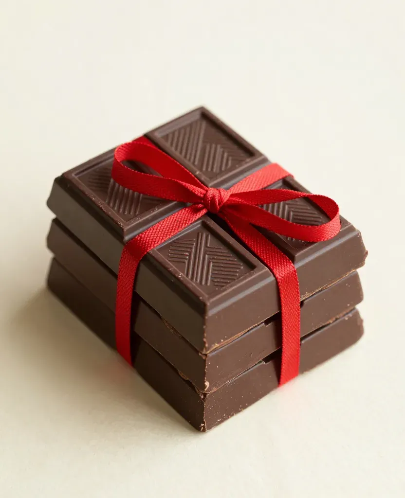 A stack of dark chocolate bars neatly tied with a vibrant red ribbon, highlighted by soft, diffused lighting that accentuates the glossy texture and rich color of the chocolate, creating a balanced and symmetrical composition against a plain white background.