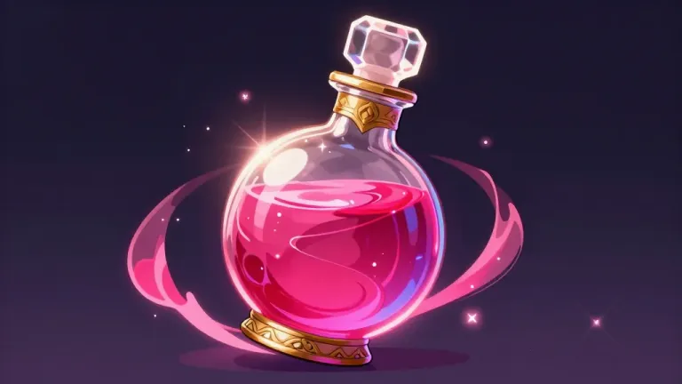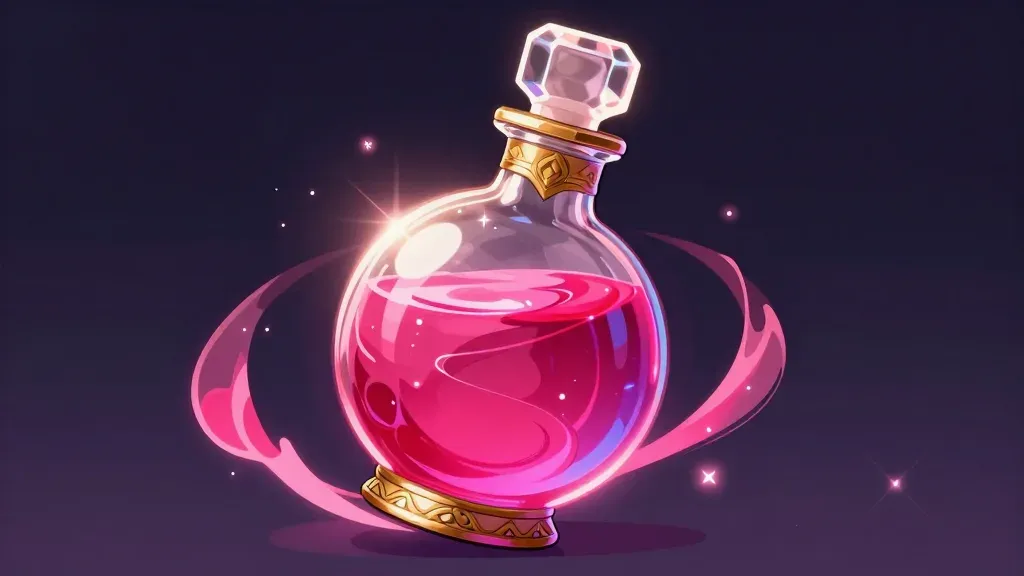 A glossy, reflective potion bottle glows with swirling pink liquid, illuminated by directional light that highlights its contours and swirling contents. The dark, blurred background with subtle sparkles emphasizes the bottle as the focal point, creating a magical and enchanting atmosphere.