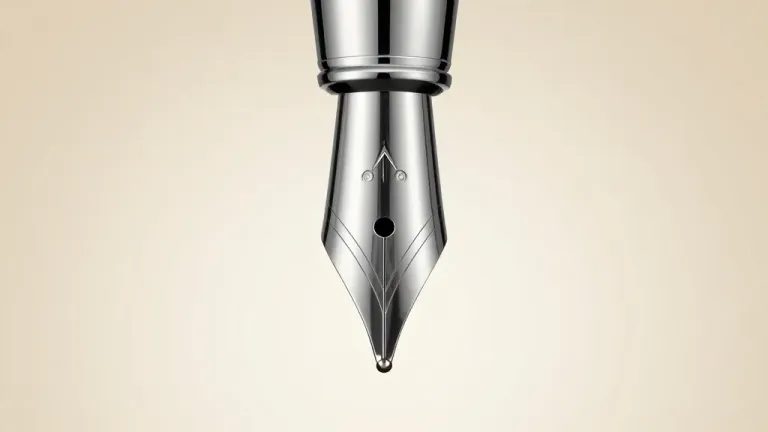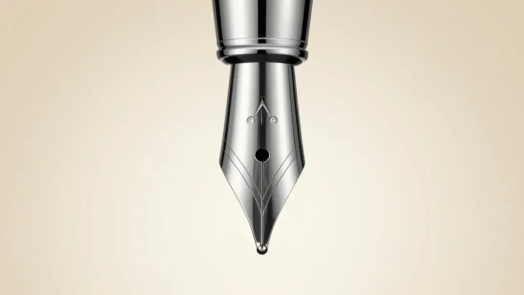 A smooth, polished fountain pen nib exudes a glossy ink droplet, illuminated by soft, diffused light that highlights the fine tip and ink's viscous texture. The shallow depth of field and neutral beige background ensure the focus remains on the intricate details of the pen and ink.
