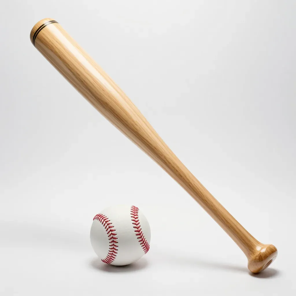 A polished maple baseball bat and a white leather baseball with vibrant red stitching rest diagonally on a seamless grey surface, showcasing smooth wood grain and taut leather texture. Soft diffused lighting from the upper left creates gentle highlights and a shallow depth of field, emphasizing the subjects against a clean, gradient backdrop with ample copy space.