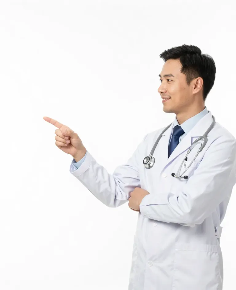 A male medical professional in a white lab coat and light blue shirt, pointing left with a stethoscope around his neck, under soft, diffused lighting. The clean, white background ensures a focused and professional presentation.