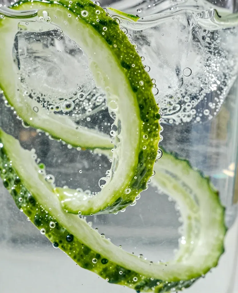 Crisp cucumber slices float in bubbly tonic water with ice cubes, creating a refreshing and vibrant scene. Soft, diffused lighting enhances the green and clear tones, drawing the eye through the composition.
