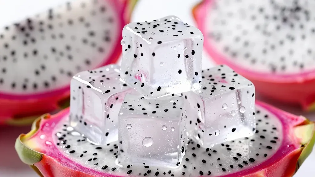 Stacked ice cubes with dragon fruit seeds create a visually striking pyramid, illuminated by soft, diffused light that enhances the glossy texture of the ice and the vibrant red rind of the dragon fruit. The blurred background with additional dragon fruit slices adds depth and context without distracting from the main subject.