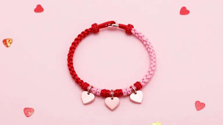 A tightly braided bracelet in red and pink cords features three glossy silver heart pendants, resting on a soft matte pink surface with scattered decorative hearts. The soft diffused overhead lighting creates subtle shadows and a shallow depth of field, emphasizing the bracelet while keeping the background elements gently blurred for visual focus.