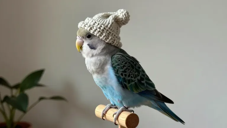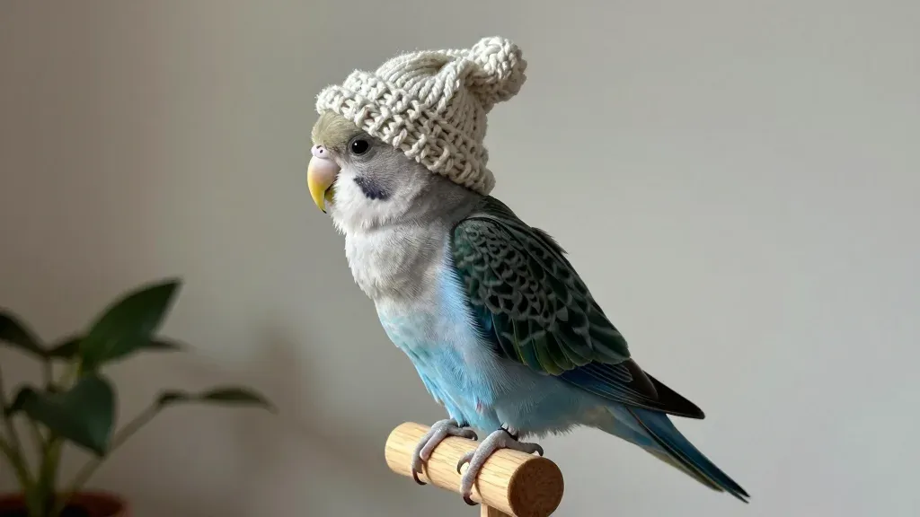 A parrot adorned with a cozy knitted beanie hat, its glossy feathers catching the soft, diffused light, creating a warm and inviting atmosphere. The shallow depth of field isolates the subject against a simple, neutral background, emphasizing the texture and detail of the parrot and its hat.