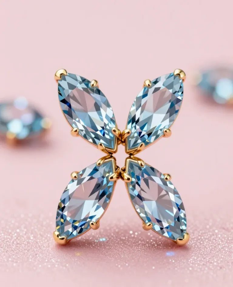 Centered marquise-cut aquamarine earrings with a polished gold setting, softly illuminated to highlight their clarity and brilliance, set against a whimsical, glittery pink background that enhances the earrings' prominence.