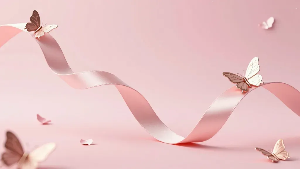 A pale pink ribbon gracefully curves diagonally across the frame, adorned with delicate white and gold butterflies, set against a soft pink background. The diffused, gentle lighting highlights the ribbon's texture and the shimmering wings, creating a serene and elegant composition.