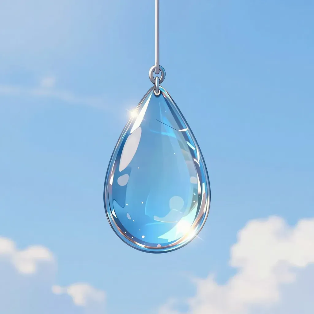 A teardrop-shaped glass pendant hangs gracefully against a serene blue sky, its glossy surface reflecting light and creating a shimmering effect. The soft, diffused lighting highlights the pendant's delicate form and adds a sense of tranquility to the composition.