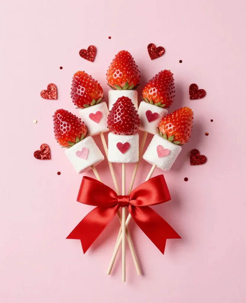 A glossy strawberry and fluffy marshmallow bouquet arranged on wooden skewers, tied with a vibrant red ribbon, set against a soft pink background with scattered red hearts, creating a festive and visually appealing composition. The diffused, soft light highlights the textures and colors, enhancing the overall aesthetic and making it perfect for Valentine's Day or romantic themes.