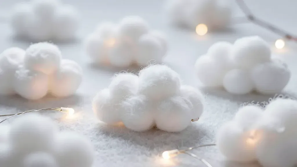 Close-up of fluffy cotton cloud shapes illuminated by warm, golden string lights, creating a serene, dreamy atmosphere. Shallow depth of field blurs the background, emphasizing the soft textures and glowing lights.