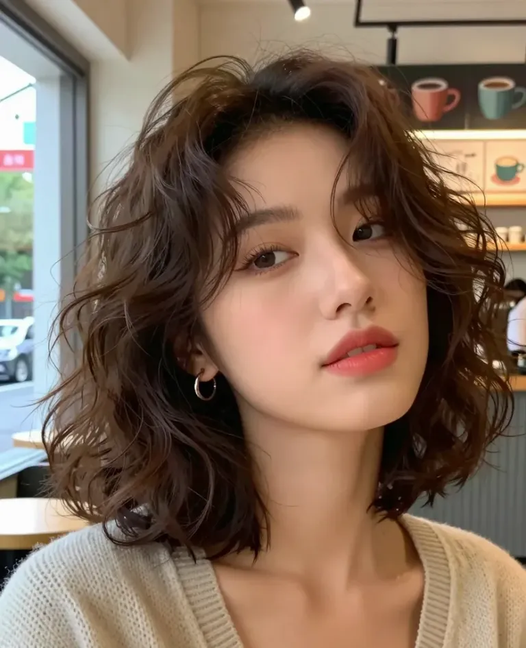 A person with wavy brown hair and light makeup poses in a coffee shop, illuminated by soft, diffused light that highlights their features and creates gentle shadows. The blurred background of shelves and cups adds depth to the composition, making it ideal for fashion or lifestyle shoots.