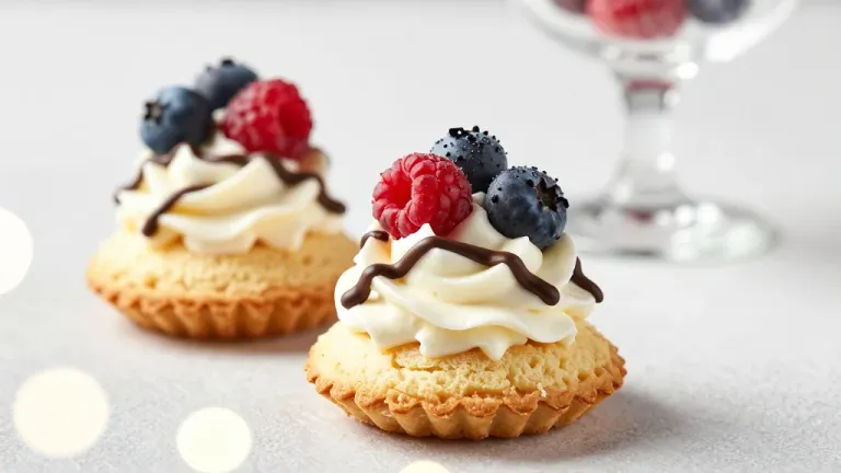 Two golden-brown tarts topped with creamy frosting, glossy berries, and a glossy chocolate drizzle, bathed in soft, diffused light that highlights their textures and colors, creating a warm and inviting atmosphere. The shallow depth of field and blurred background suggest a setting of indulgence and celebration, with ample copy space for text or branding.