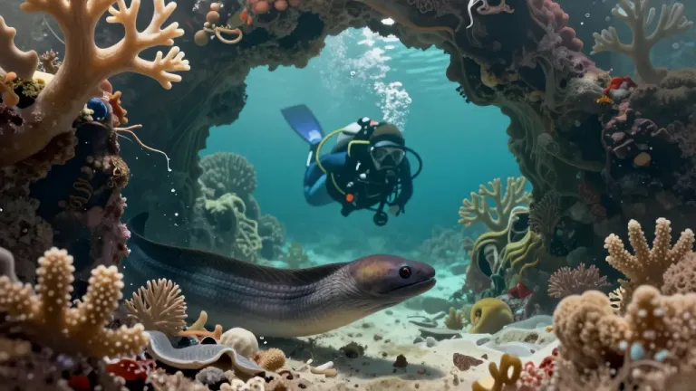 A diver navigates through a vibrant coral archway, illuminated by soft, diffused light that enhances the rich hues of the underwater scene. The composition is framed by the arch, drawing attention to the diver against a blurred background of diverse coral formations and sandy ocean floor.