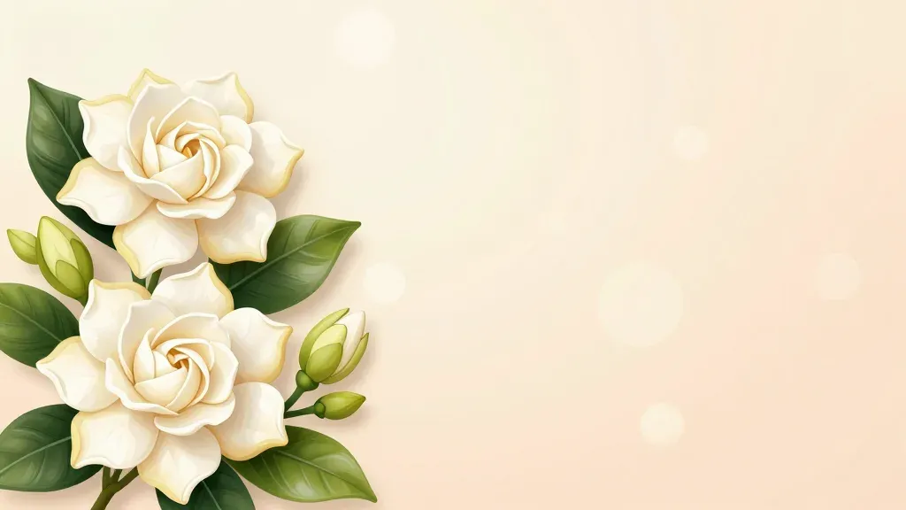 A creamy gardenia flower with fully bloomed petals and buds, set against a soft, diffused light from the top left, creating gentle highlights and shadows. The blurred, warm beige background with bokeh effect provides a soft, elegant backdrop.