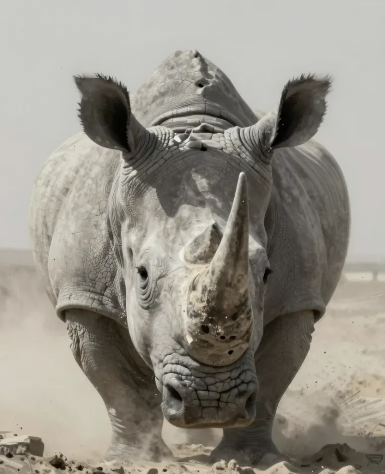 A close-up of a desert rhino facing forward, with its large ears flapping and glossy horn, set against a dusty, sandy desert landscape. The high contrast and sharp shadows highlight the rhino's rough, textured skin and the monochromatic color palette of grey, white, and beige.