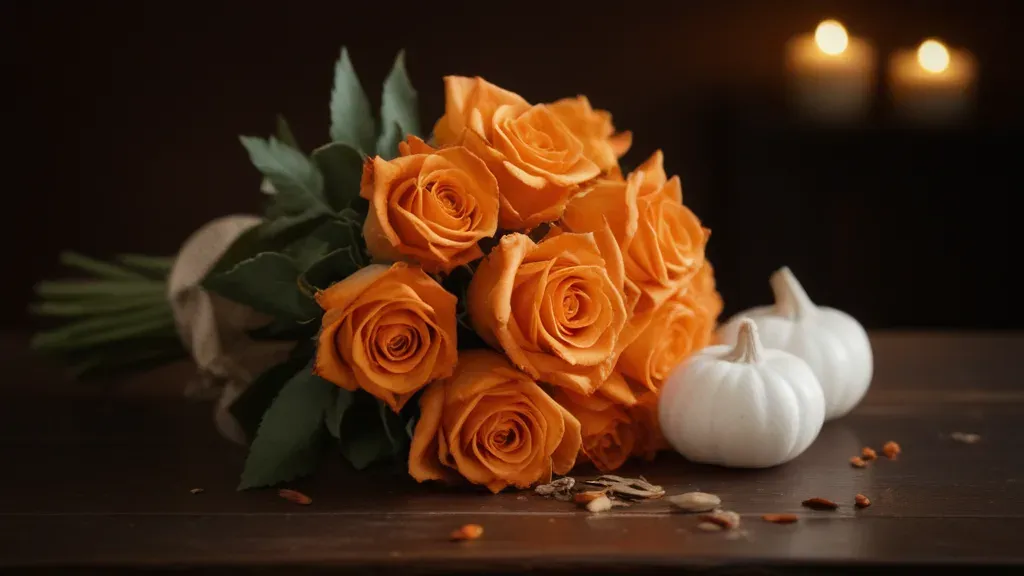 A bouquet of glossy orange roses and smooth white pumpkins is arranged on a rustic wooden table, softly illuminated by warm candles, creating a cozy autumnal ambiance. The shallow depth of field draws attention to the vibrant colors and textures, making it ideal for design elements or as a centerpiece.