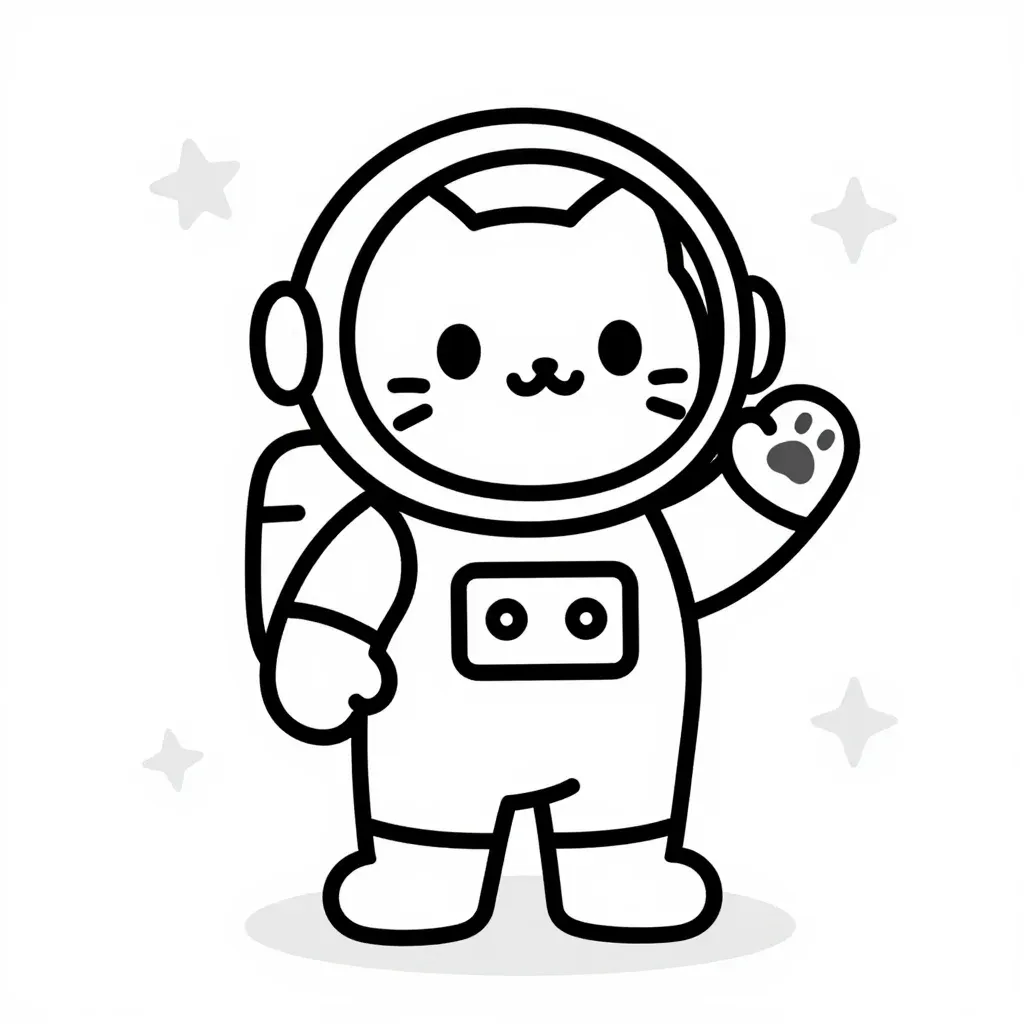 A stylized cartoon cat in a full spacesuit waves cheerfully with one paw, its helmet reflecting soft light and the suit rendered with smooth, glossy lines. The image features even top-down lighting, a centered composition, and a clean white background with faint star motifs, providing ample negative space for design integration.