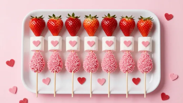 Neatly arranged skewers of glossy strawberries and soft marshmallows with crunchy sprinkles, illuminated by soft diffused light that highlights their textures, creating a visually appealing and inviting grid-like pattern against a soft pink backdrop adorned with scattered red hearts.