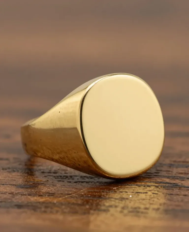 A polished gold signet ring with engraved details rests on a rich, dark brown wooden surface, softly lit to highlight its smooth texture and slight sheen. The shallow depth of field draws attention to the ring, creating a clean and elegant composition.