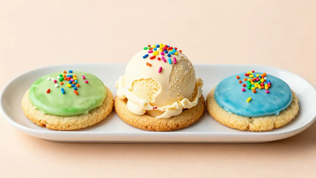 Soft, glossy sugar cookies adorned with vibrant, colorful sprinkles and smooth icing, illuminated by soft, diffused light that highlights the texture and color, creating a visually appealing and appetizing display.