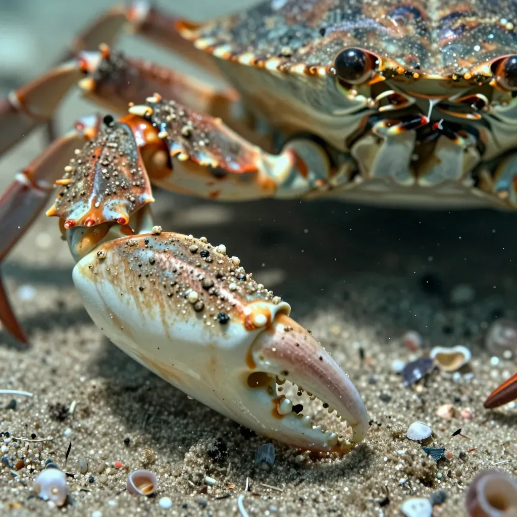 A close-up of a crab's glossy, textured claw against a sandy, shell-strewn ocean floor, illuminated by diffused underwater light that highlights the intricate details and natural textures of the subject and its environment.